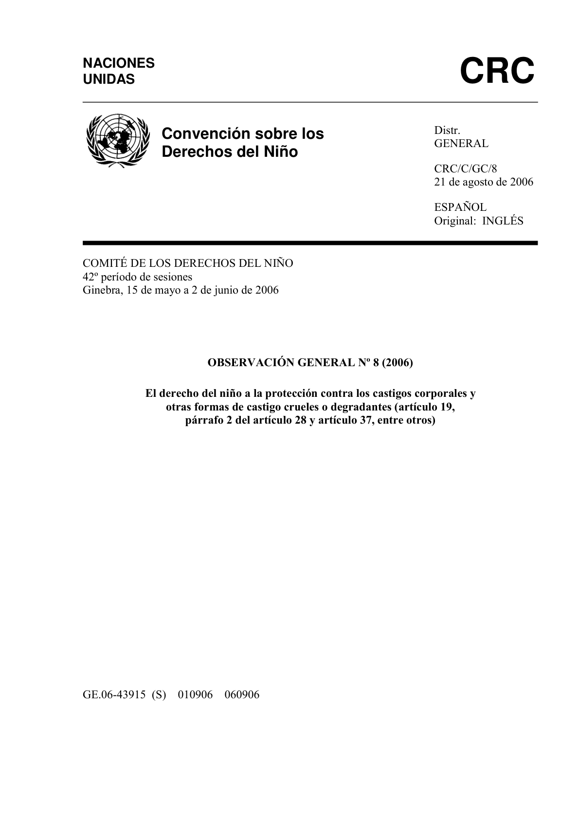 Observación general 8 (2006) El derecho del niño a la protección contra el castigo corporal y otras formas de castigo crueles o degradantes